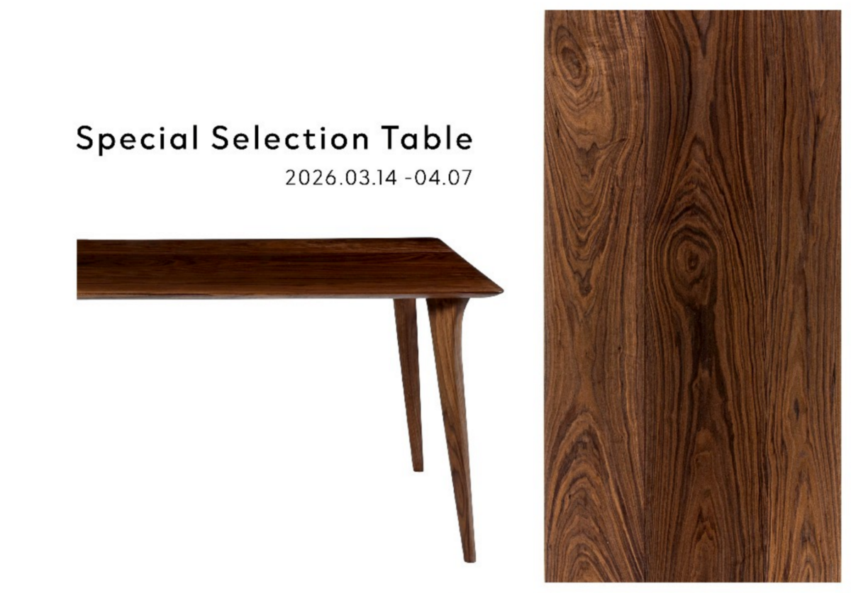 10年かけて集めた材の中から、今回は特に希少な幅広の材を使い、職人が意匠を凝らしてアートのように木目合わせして天板を製作しました。